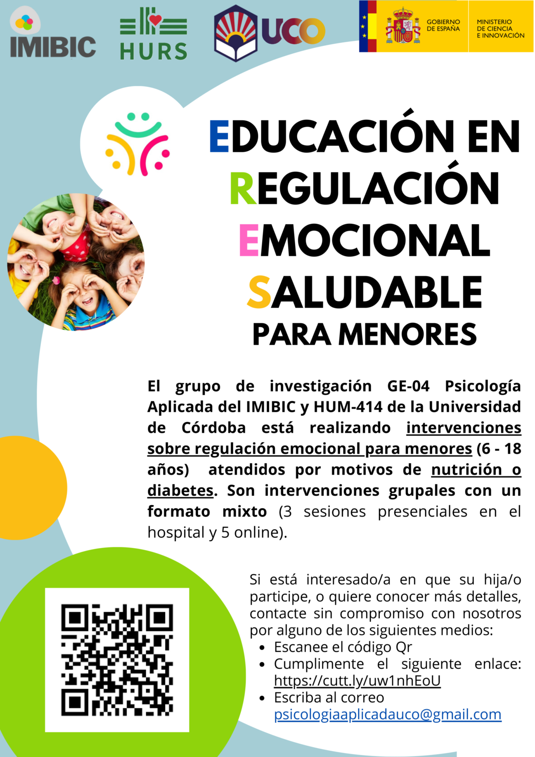 El grupo de investigación GE-04 Psicología Aplicada del IMIBIC y HUM-414 de la Universidade Córdoba está realizando intervenciones sobre regulación emocional para menores (6 -18 años) atendidos por motivos de nutrición o diabetes. Son Intervenciones grupales con un formato mixto (3 sesiones presenciales en el hospital y 4 online).